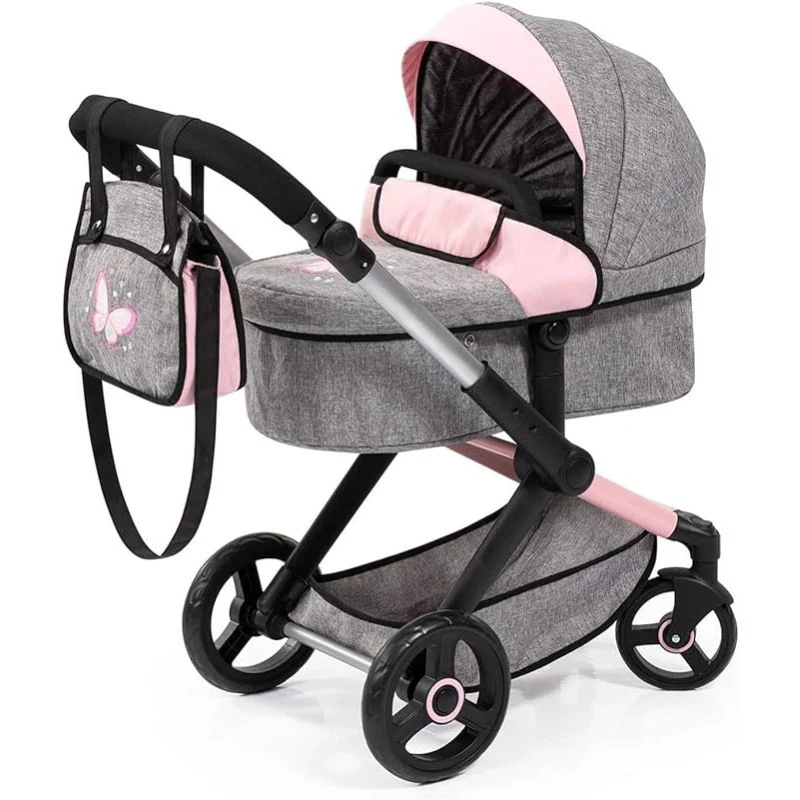 The combi doll’s pram XEO has a modern design and is suitable for dolls up to 18 inch. With its adjustable handle, this doll's pram is easily adaptable to your child's height; also, it's possible to mount the carrycot in direction of travel or towards your child. With the reversible handle a change of the direction is also possible. The doll’s pram can be easily converted to a pushchair with press buttons and with the change of the angle of the carrycot. The carrycot’s cover will either way; if she's sitting or lying in the pram; protect the little doll from sun and wind. The swivel front wheels assure a stable cornering. The accompanying bag has a long handle to be used as a shoulder bag and two short ones as a handbag. Additionally, it includes a zipper to close the bag safely. For more storage space the integrated shopping basket is also perfect to keep everything stored.