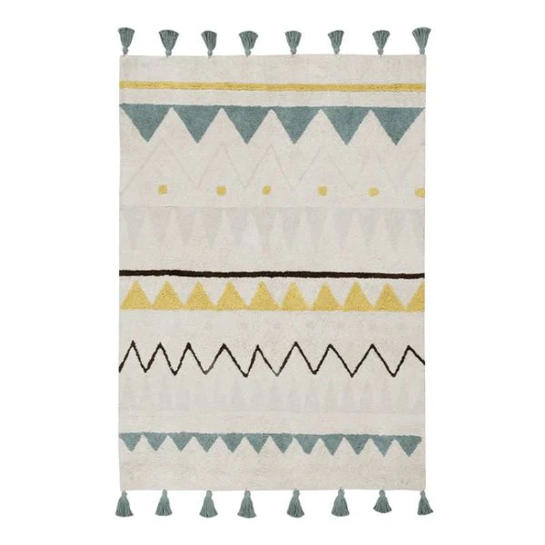 This Lorena Canals Azteca Natural Vintage Area Rug draws upon the natural color of cotton, using it as a base to propel the tribal shapes commonly known as the Azteca pattern. As with all Lorena Canals rugs, each piece is hand made including the details of the pompons that you will find on this rug. This Azteca Collection lends itself well to a vintage inspired room although it is much loved by those who like a touch of whimsicalness, as demonstrated by its fun colors and tassels. This Lorena Canals Azteca Natural Vintage rug is a great way of adding texture and warmth to a room that calls for a touch of color in a discreet manner.