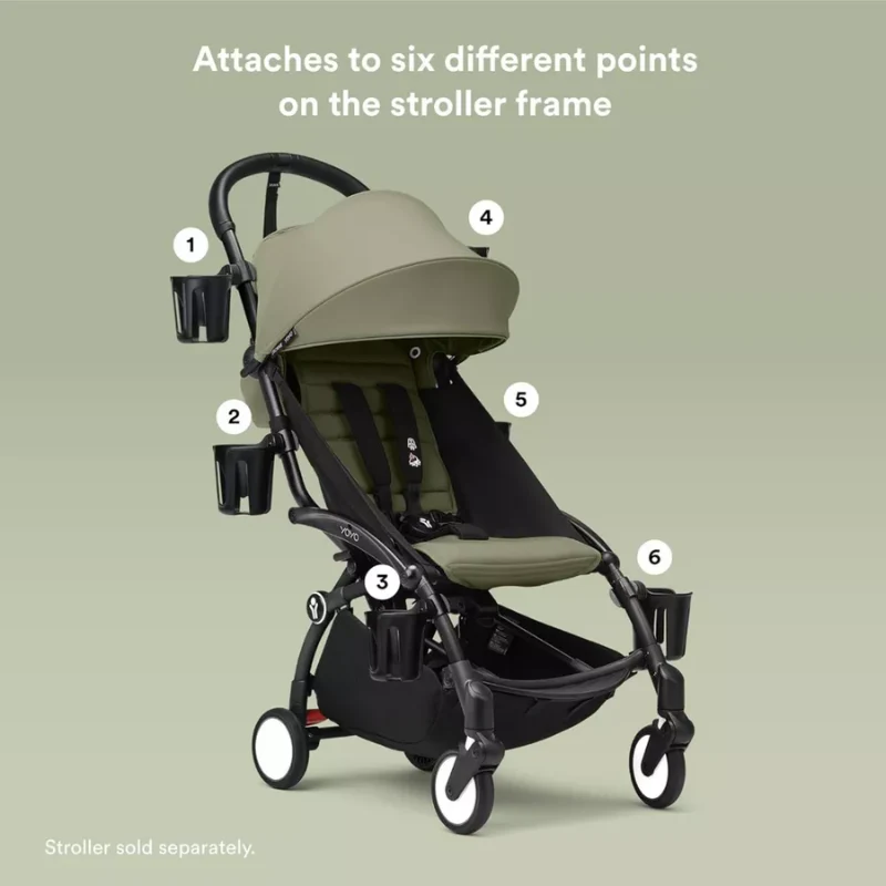 Take your drinks on the go.The cup holder has been specially designed for YOYO. It is very stable, and has a hook specifically designed to be attached to 6 different points on the stroller frame. Keep your drinks close at hand by installing a cup holder for you and one for your baby.